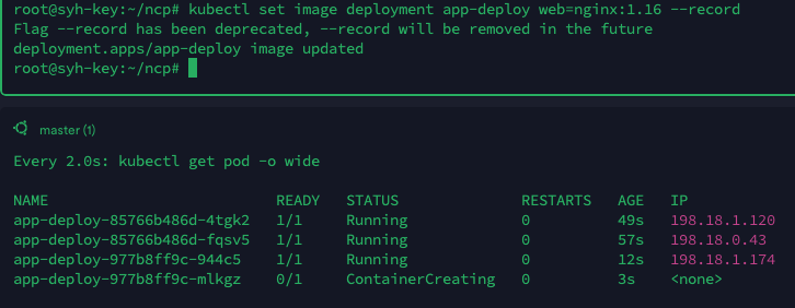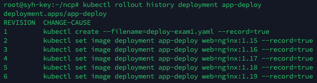 - kubectl set image deployment app-deploy web=nginx:1.15 --record=true