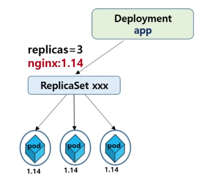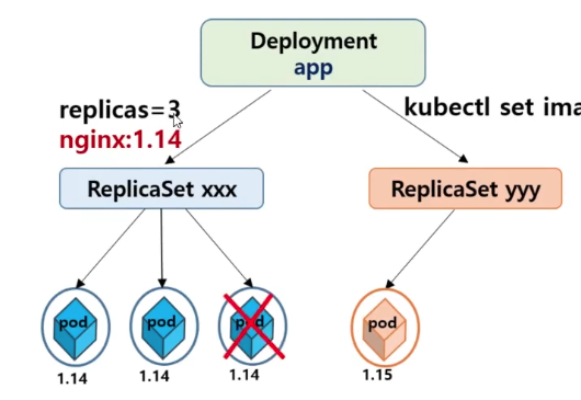 - app이라는 Deployment로 nginx:1.14를 3개 운영중이다. 이걸 1.15로 업데이트 해보자