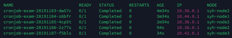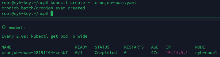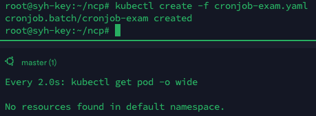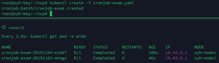 - cronjob은 complete 상태로 끝나는게 아니라 설정한 스케쥴대로 정해진 기간마다 반복해서 실행