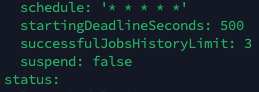 - startingDeadlineSeconds : 500초 안에 JobTemplate에 정의된 애플리케이션이 실행을 못하면 그 작업을 취소시키겠다.
