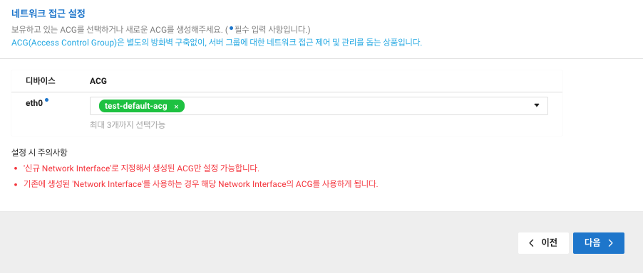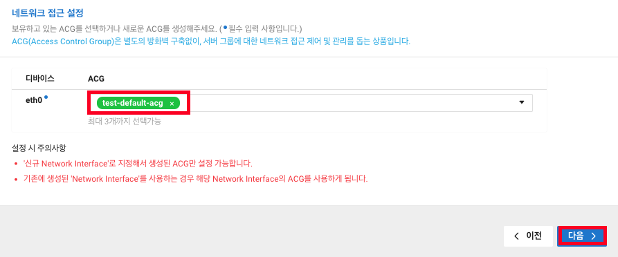 - 서버마다 3개의 ACG를 적용할 수 있는데 지금은 ACG를 따로 생성하지 않았으니 default acg를 선택하고 다음을 클릭합니다.