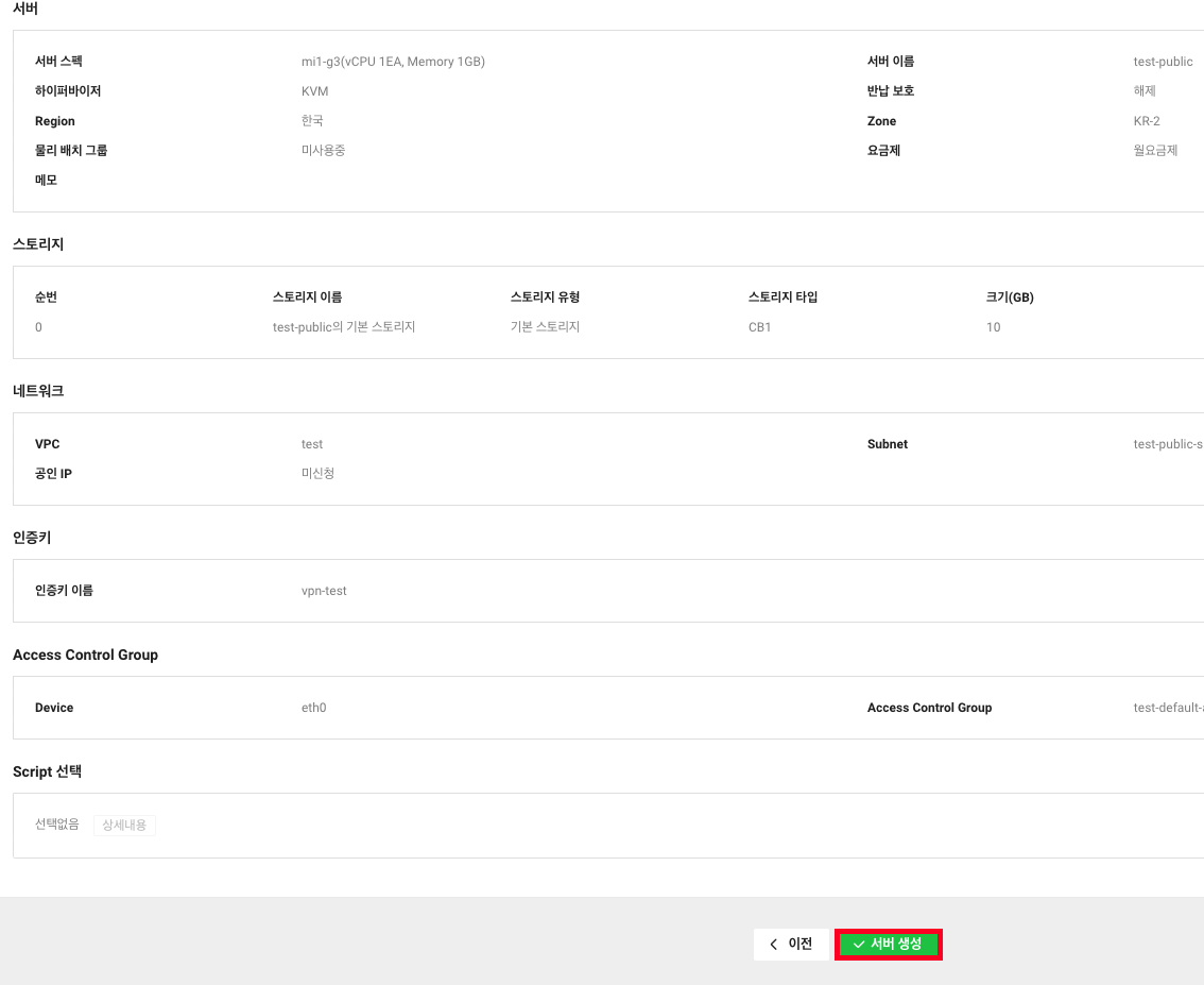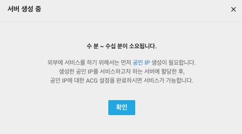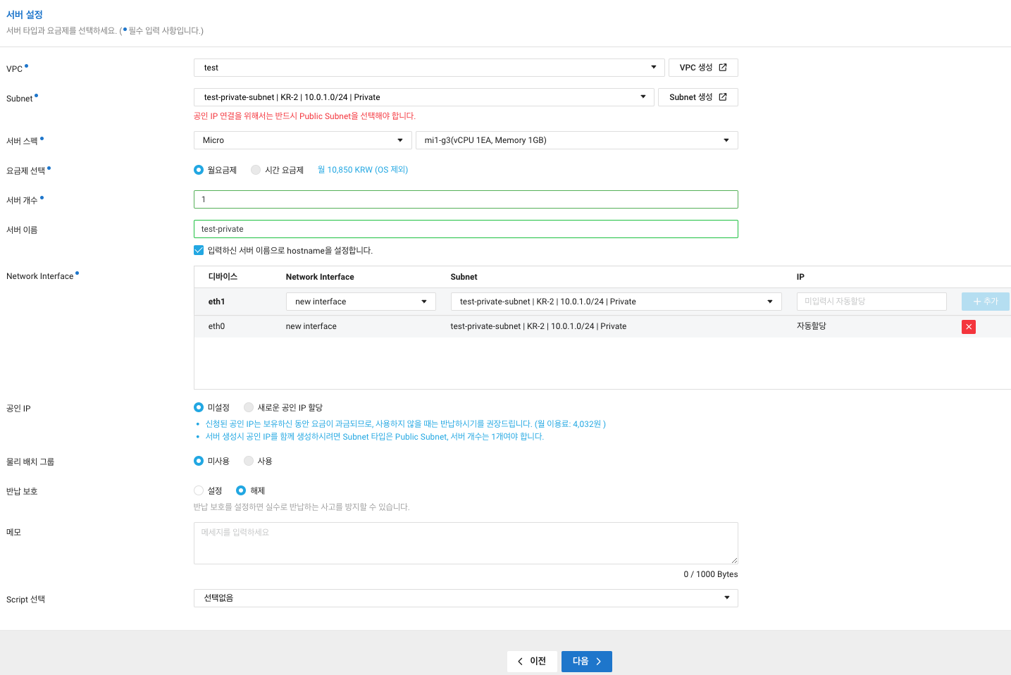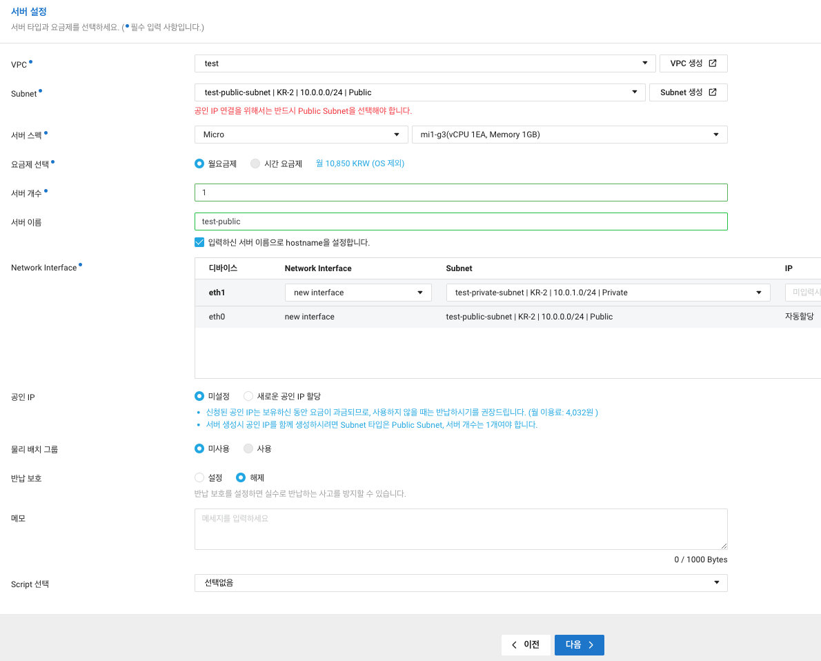 공인 IP는 서버 생성시 바로 할당할 수 있지만 지금은 바로 할당하지 않고 미설정으로 하고 나중에 따로 할당하겠습니다.