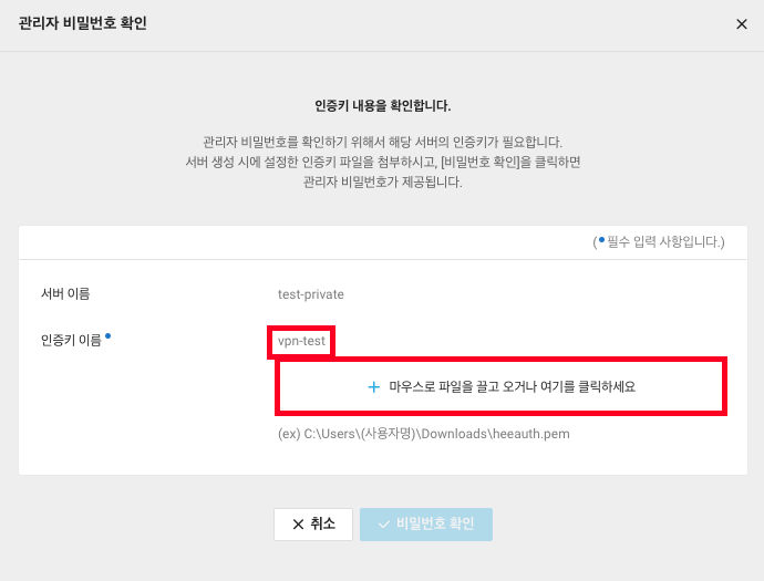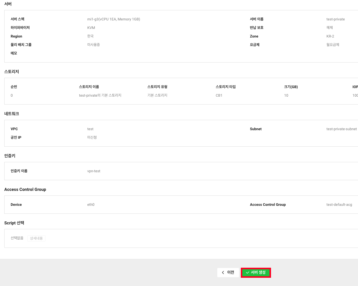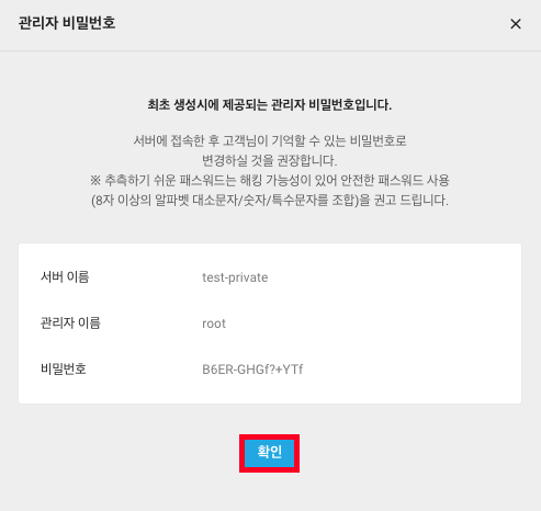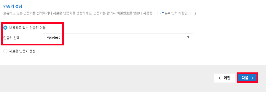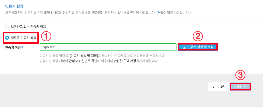 - 서버 생성시 인증키를 적용하게 되는데 이 인증키를 통해 서버의 초기 패스워드를 확인 할 수 있으니 인증키를 잘 보관하셔야 합니다.