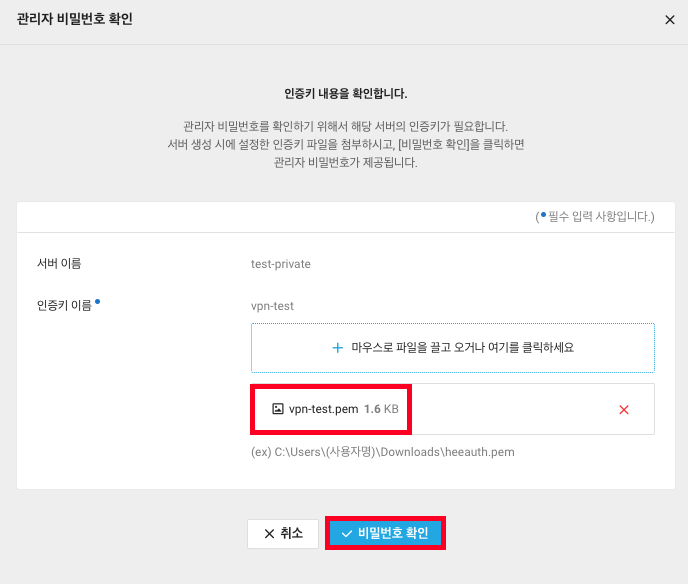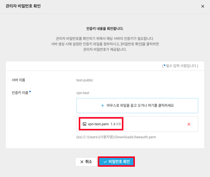 15. 해당 인증키가 제대로 선택되었는지 확인하고 비밀번호 확인을 클릭합니다.