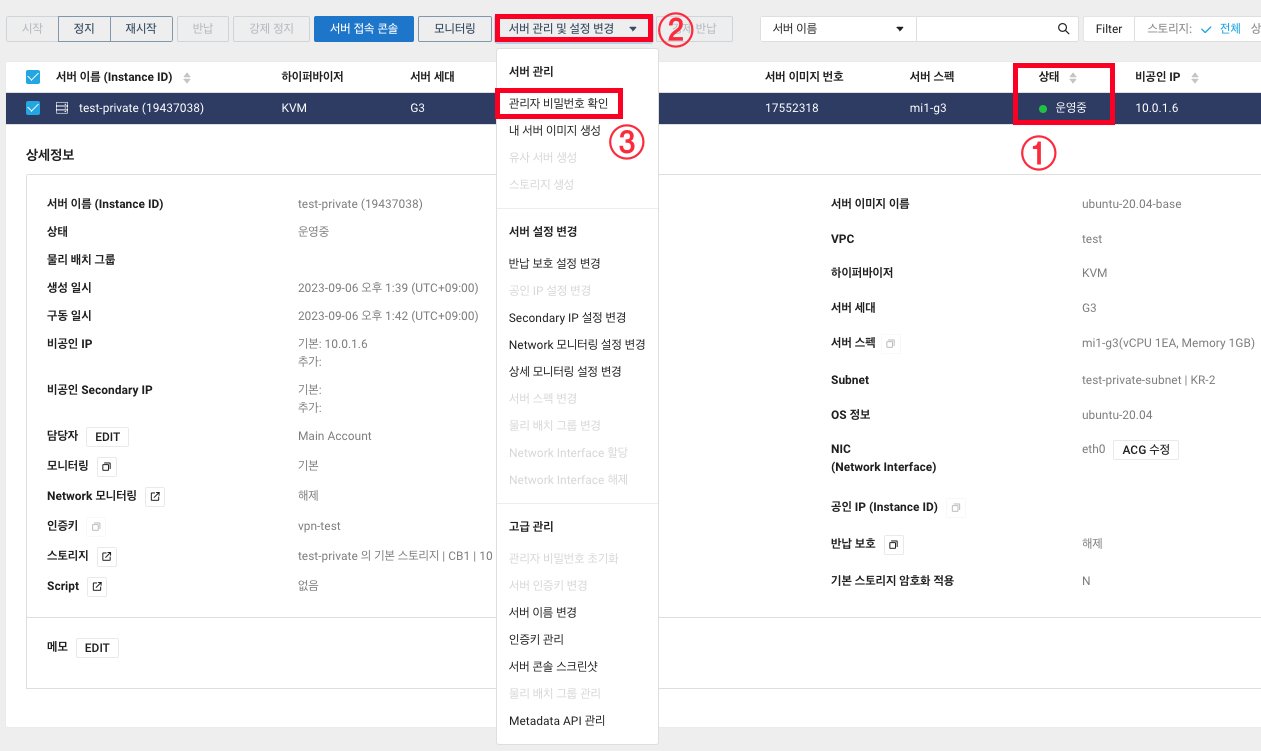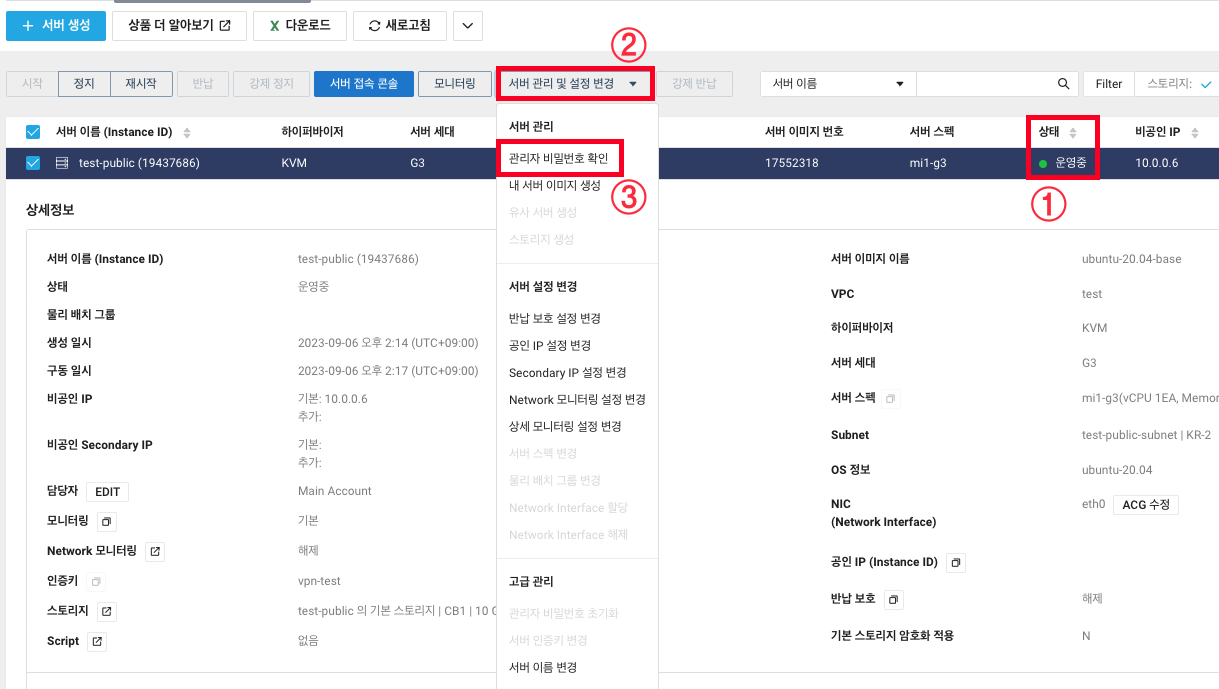 상태가 운영중으로 바뀌었다면 상단의 서버 관리 및 설정 변경 -> 관리자 비밀번호 확인을 클릭합니다.