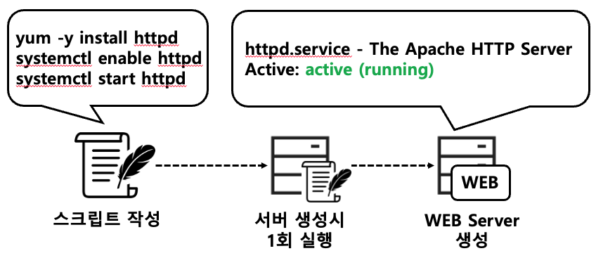 > 서버가 생성될때 딱 한번 실행되는 스크립트로 필요한 패키지 설치, 서비스 등록 등을 수행
