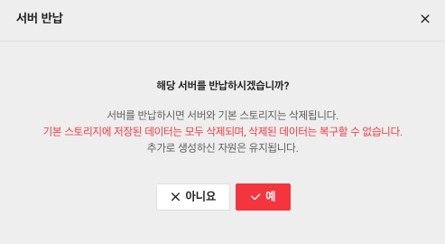 반납 보호 : 실수로 서버를 반납하는 경우를 방지하는 옵션으로 해당 옵션을 사용하면 해제 전까지 서버를 반납할 수 없습니다.