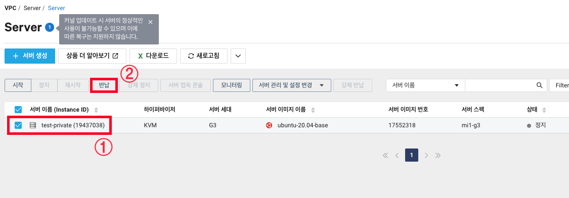 19. 서버가 정지상태가 되었다면 다시 서버를 선택 후 반납을 클릭합니다.