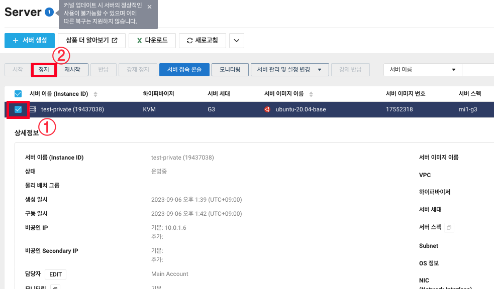 18. Public으로 서버를 재생성하기 위해 서버를 선택 후 정지를 클릭합니다.