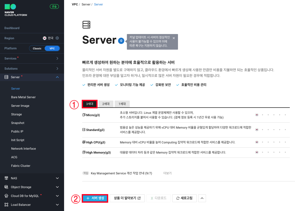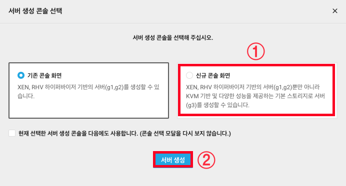 3. 서버 생성 콘솔 선택창이 뜨는데 3세대 서버를 생성을 위해 신규 콘솔 화면을 선택 후 서버 생성을 클릭합니다.