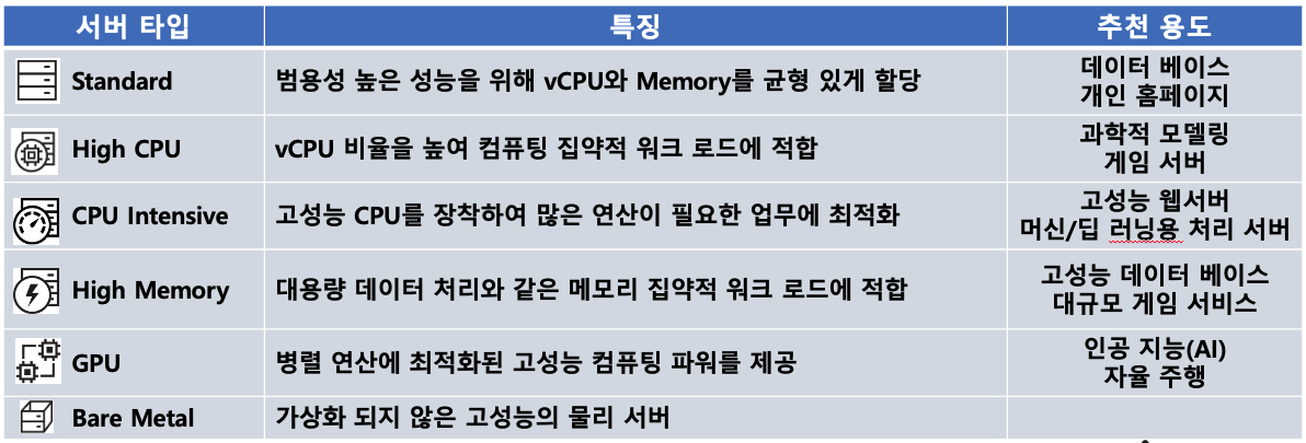 > 서비스 규모와 사용 목적에 따라 적합한 성능의 서버를 선택할 수 있다록 다양한 서버 타입을 제공