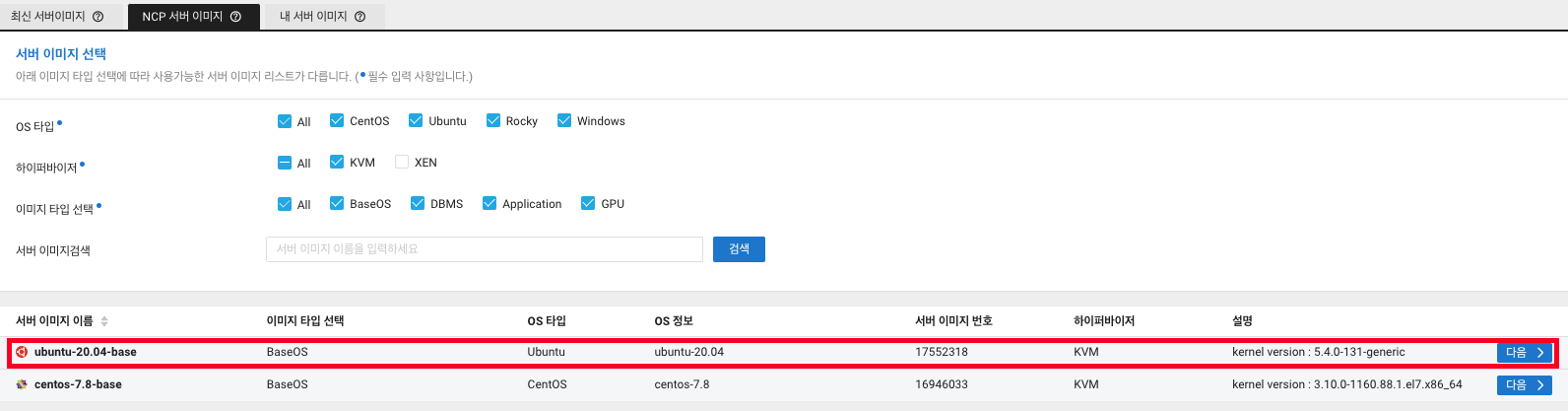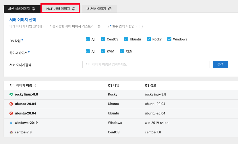 4. 바로 보이는 창은 최신 서버이미지만 보이니 NCP 서버 이미지를 클릭해봅니다.