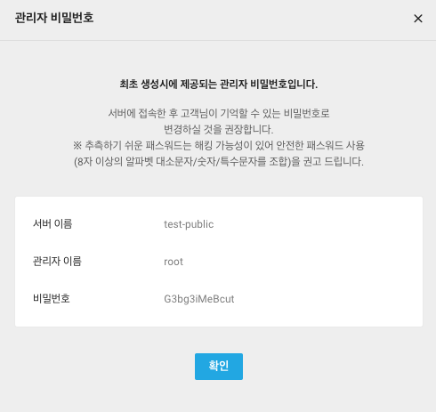 16. 서버의 관리자 ID와 PW를 확인하고 확인을 클릭합니다.