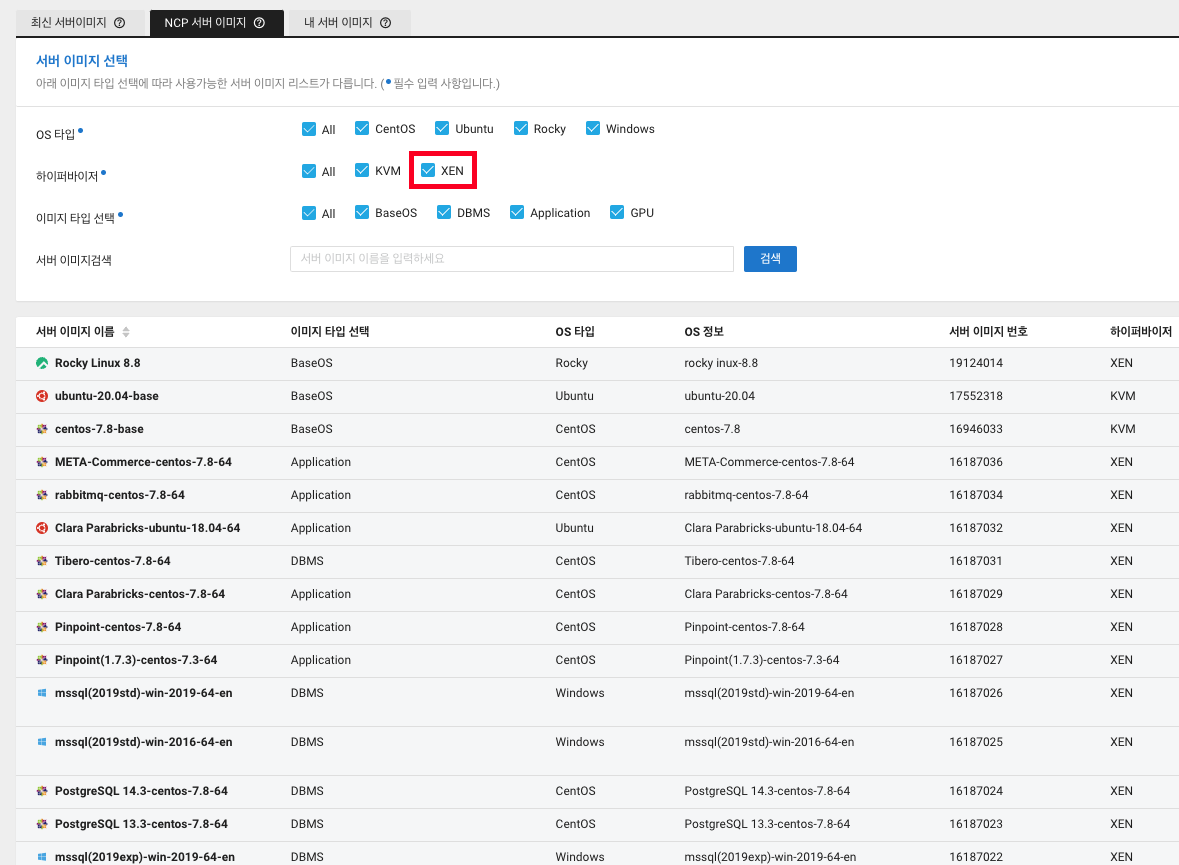 3세대(KVM) 서버 이미지만 보고 싶으니 2세대(XEN)을 클릭해서 체크해제 해줍니다.