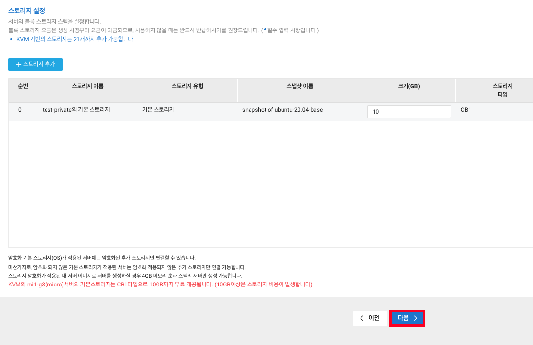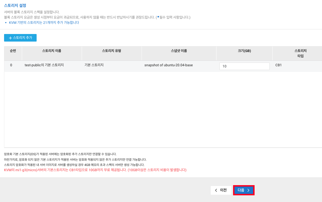 Micro 서버는 기본 스토리지 10GB까지만 무료이므로 그대로 두고 다음을 클릭합니다.