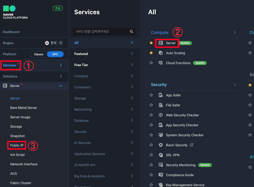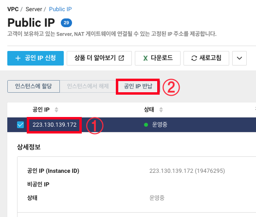 1. Service -> Compute -> Server -> Public IP를 클릭합니다.
