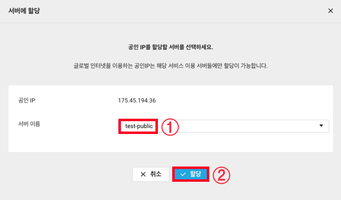 7. Public IP를 할당하고자 하는 서버를 선택 후 할당을 클릭합니다.