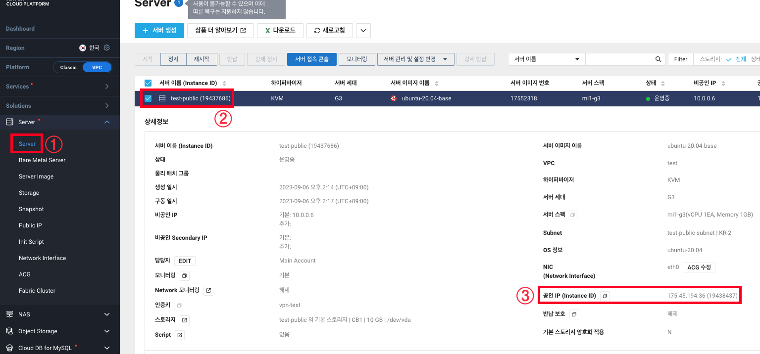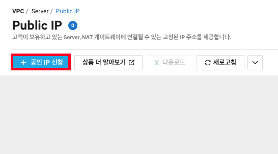 1. Service -> Compute -> Server -> Public IP를 클릭합니다.
