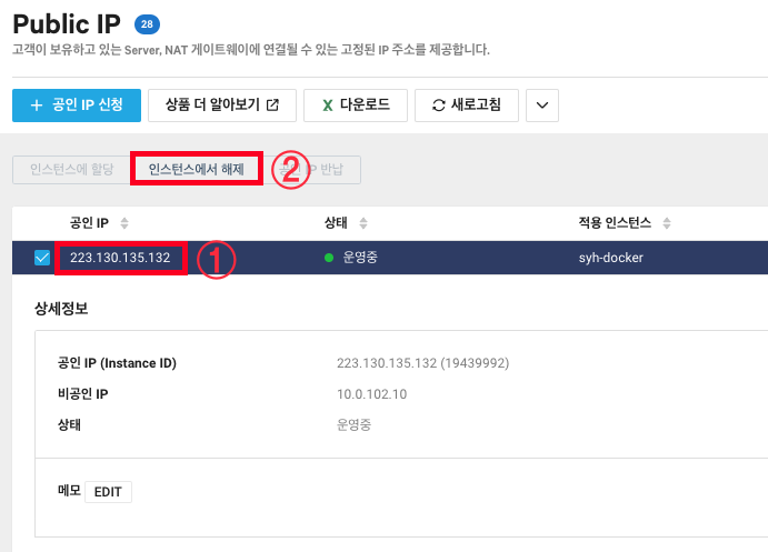 8. 만약 공인 IP 할당을 해제하고 싶다면 공인 IP 선택 후 인스턴스에서 해제를 클릭하시면 됩니다.