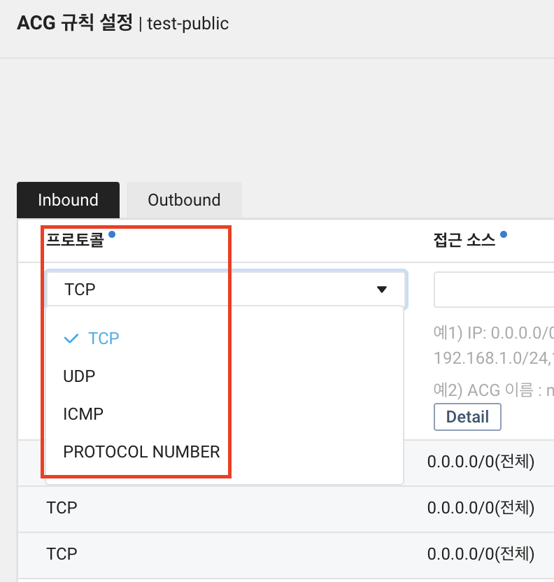 5. ACG는 외부에서 내부로 접근하는 Inbound, 내부에서 외부로 나가는 Outbound 설정을 할 수 있으며, 상세 규칙으로는 프로토콜(TCP,UDP,ICMP, PROTOCOL NUMBER), 접근소스(특정IP, IP대역), 허용포트(단일, 범위)를 설정할 수 있습니다.