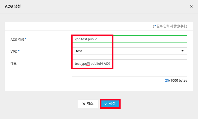 3. ACG 이름을 정하고 해당 ACG를 어느 VPC에 생성할건지 선택 후 생성을 클릭합니다.