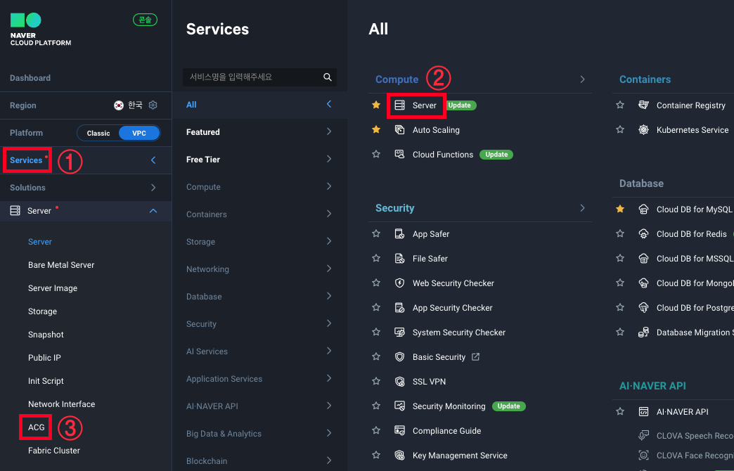 1. Service -> Compute -> Server -> ACG를 클릭합니다.