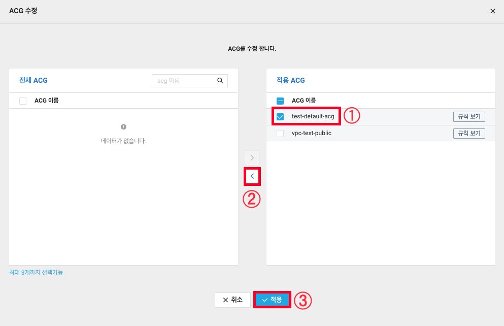 9. 새로 생성한 ACG 선택 후 > 를 클릭해서 적용 ACG로 옮겨줍니다.