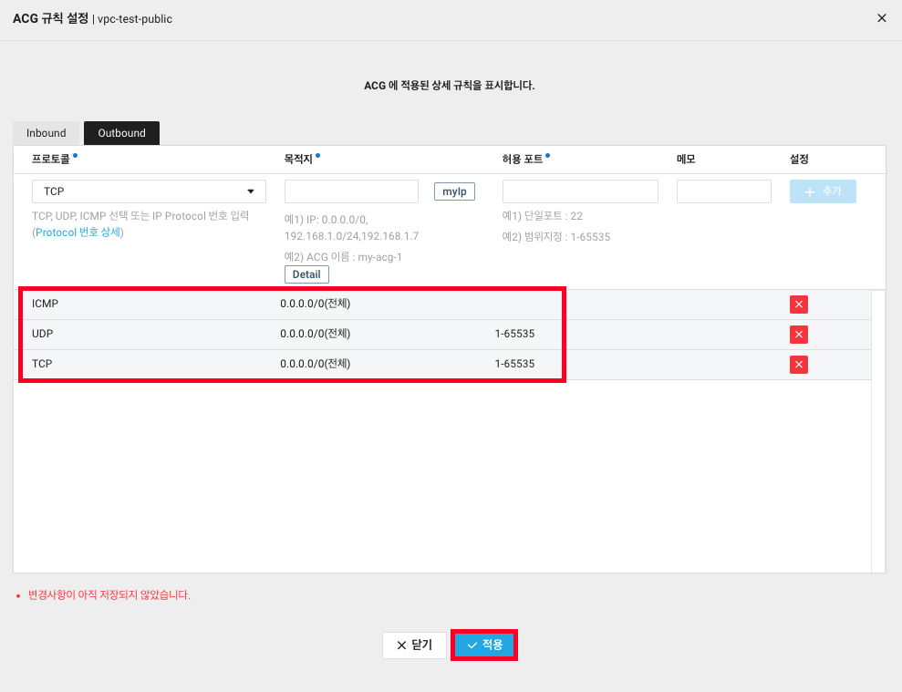 7. 서버에서 외부로는 어떤 요청이든 가능하게 전부 오픈해주고 적용을 클릭합니다.