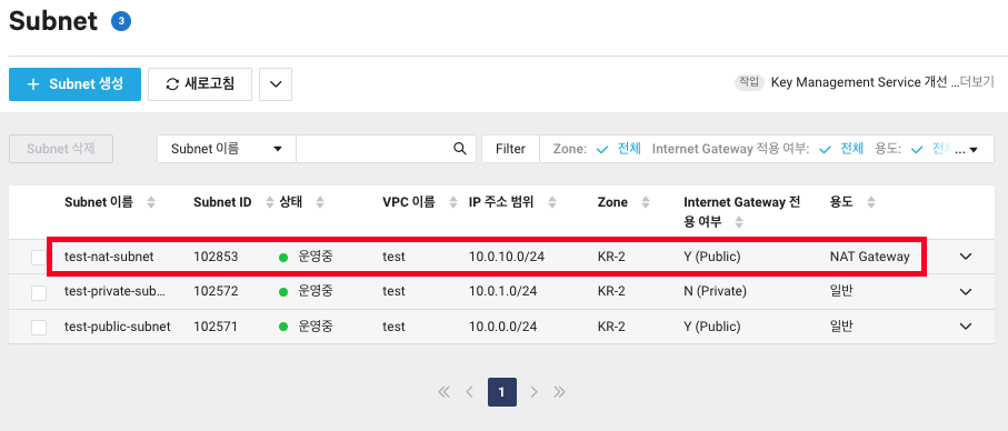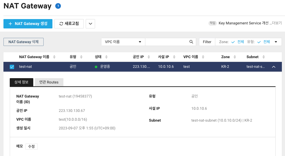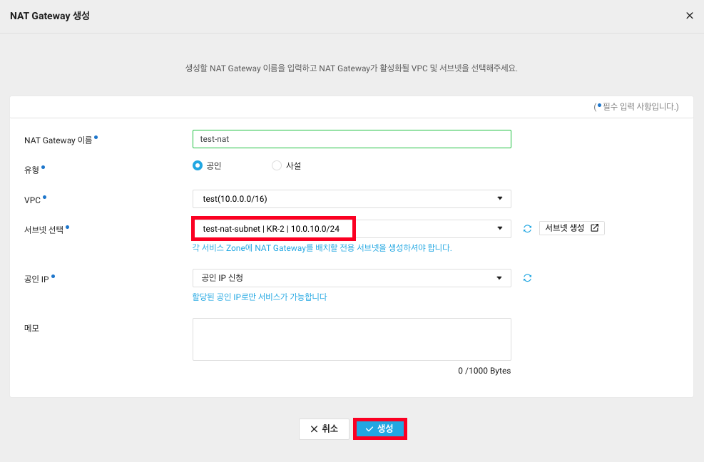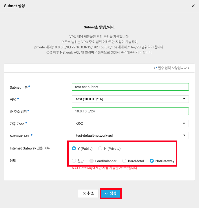 22. 방금 생성한 Nat용 Subnet 선택, 외부 통신을 위해서 유형은 공인, 공인 IP 신청도 그대로 놔두고 생성을 클릭합니다.