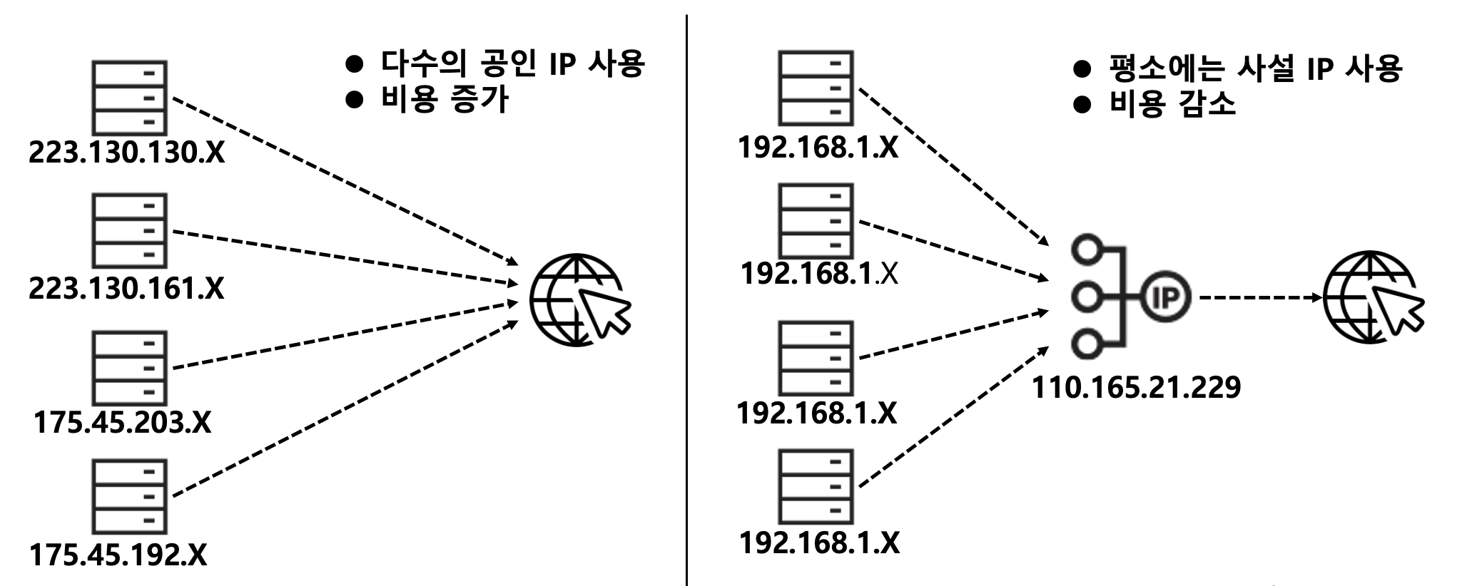 - 비공인 IP를 가진 여러 대의 서버가 외부 서버와 통신할 수 있도록 연결할 수 있기에 서버마다 공인IP를 부여할 필요가 없어 비용을 절감할 수 있습니다.