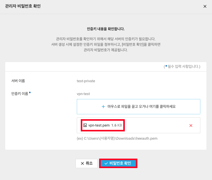 11. 설정했던 인증키를 선택하고 비밀번호 확인을 클릭합니다.