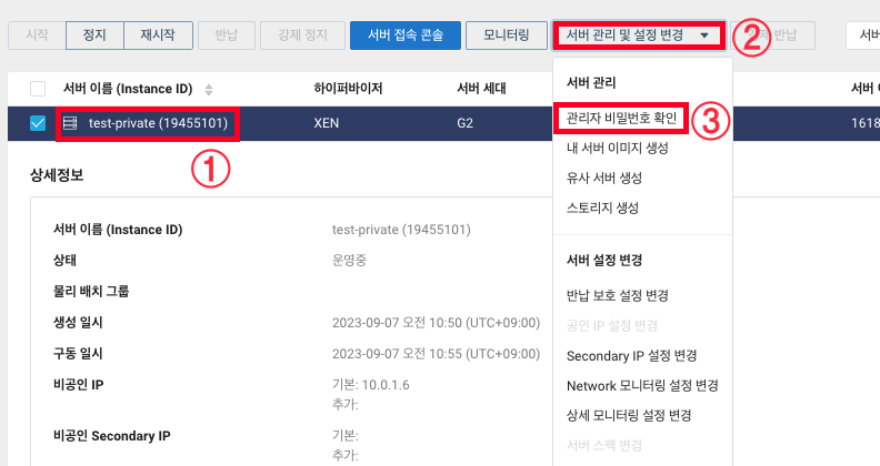 10. 서버에 접속에 ID와 PW가 필요하니 생성완료된 Private 서버 선택 -> 서버 관리 및 설정 변경 -> 관리자 비밀번호 확인을 클릭합니다.