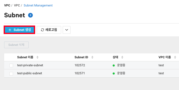 19. 현재 Public과 Private 2개의 Subnet이 있습니다. NAT용을 만들기 위해 Subnet 생성을 클릭합니다.