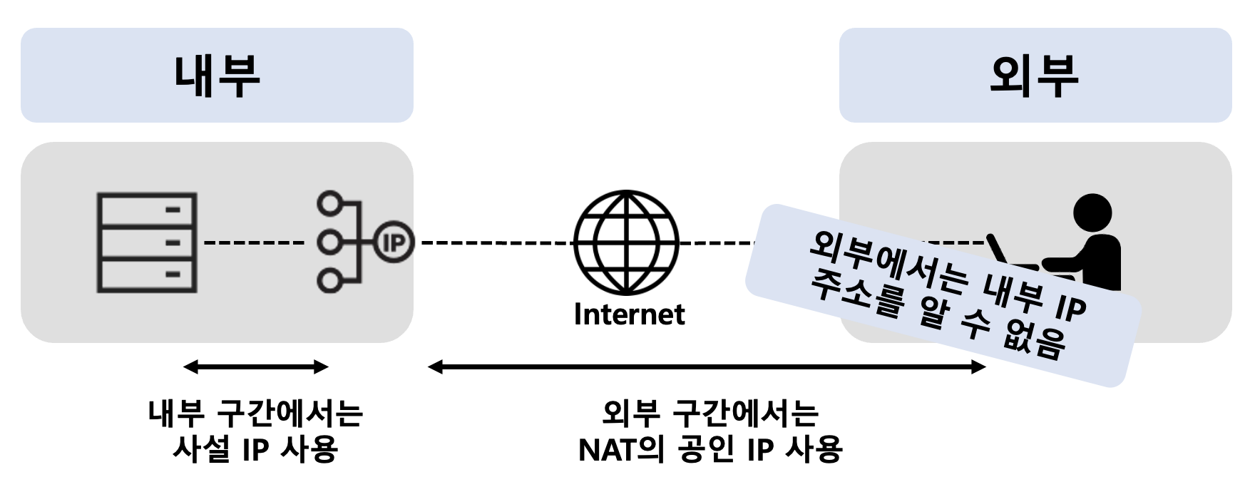 - 외부 통신이 NAT의 대표 IP를 이용한 외부 서버와의 접속하기 때문에 외부에서는 내부의 IP 주소를 알 수 없습니다.