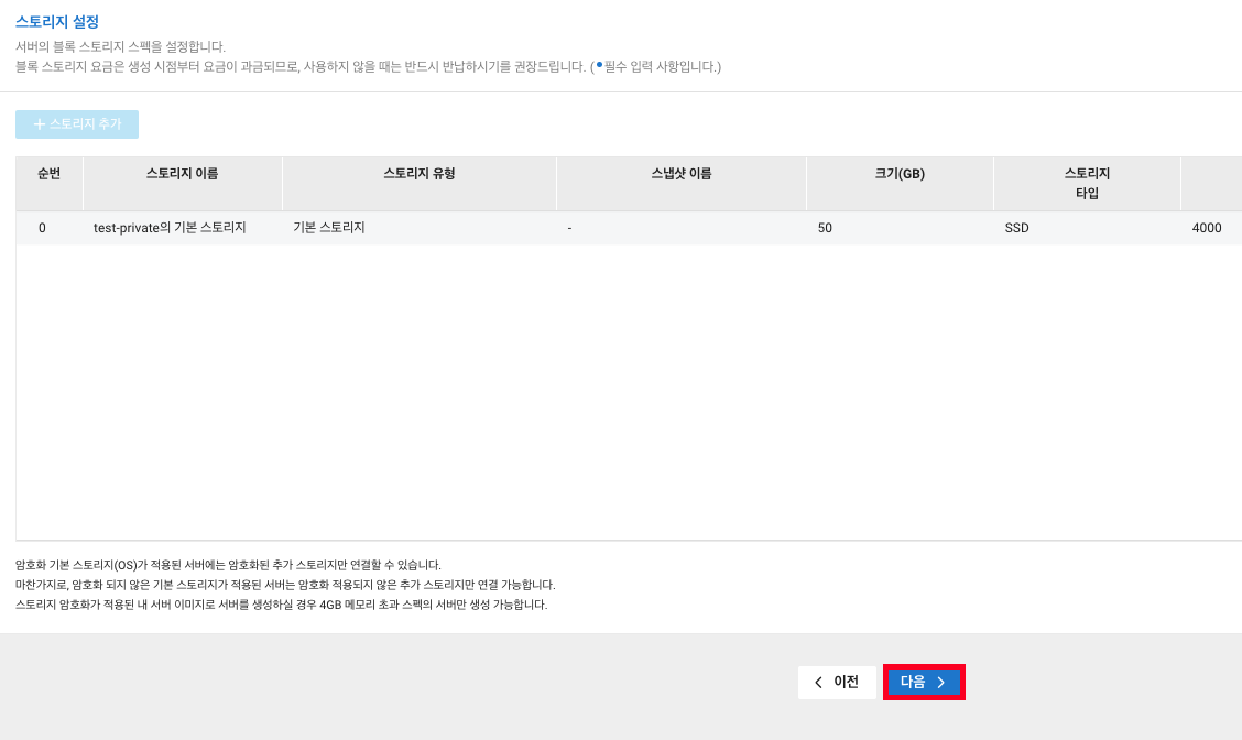 5. 2세대 서버는 기본 스토리지 용량 조절이 불가능합니다. 다음을 클릭합니다.