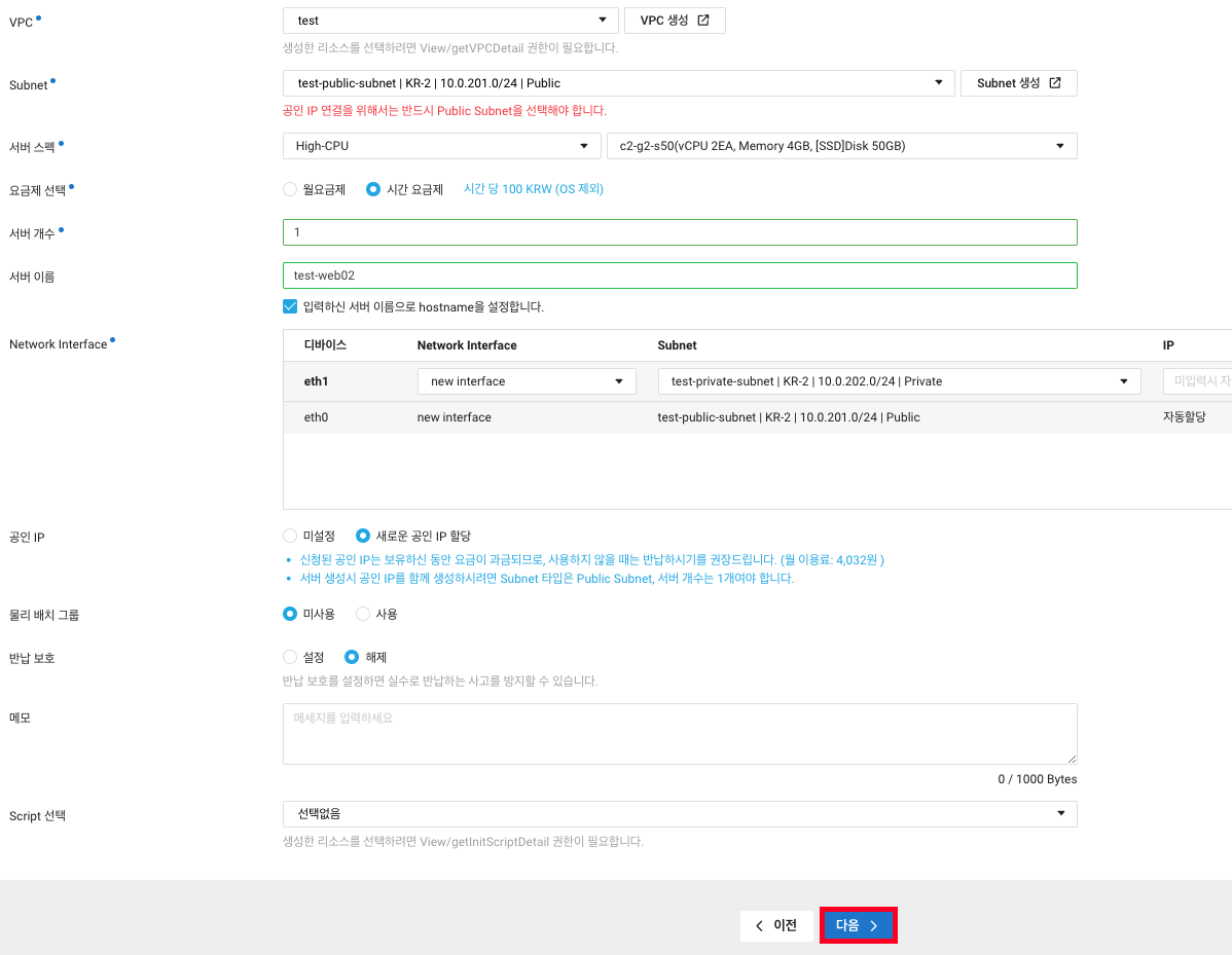 2. 서버의 정보들은 web01 서버와 통일 시키고 이미 Nginx가 설치된 Web서버의 이미지이기에 Script는 미선택 하겠습니다.