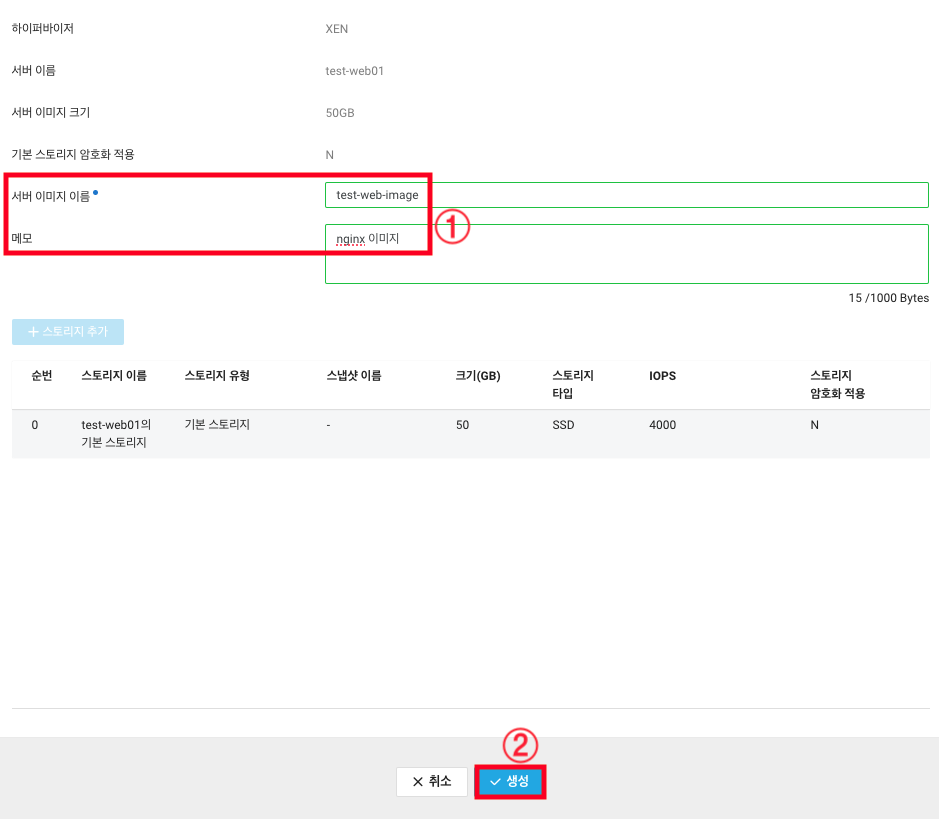 2. 이미지를 구분하기 위해 이름과 메모를 적고 생성을 클릭합니다.
