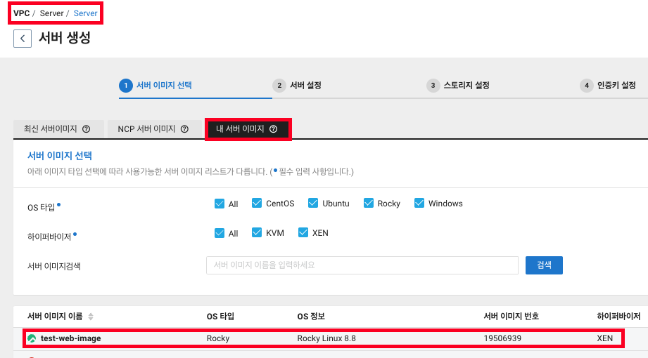 사용하고 싶은 이미지를 선택 후 서버 생성을 클릭합니다.