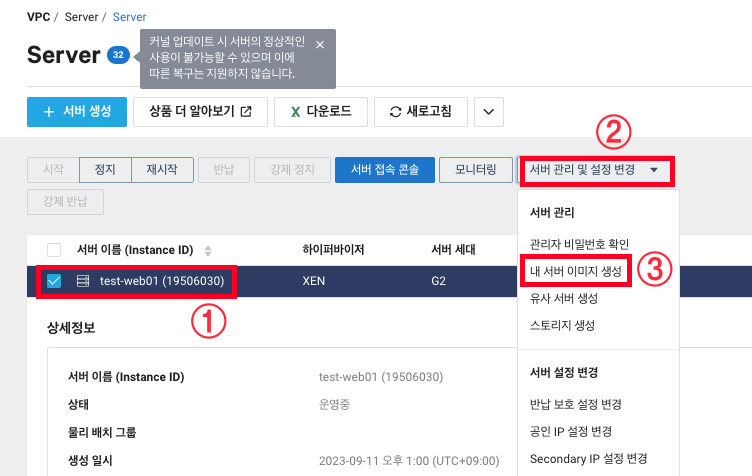 1. Server 목록에서 이미지를 생성할 서버를 선택 -> 서버 관리 및 설정 변경 -> 내 서버 이미지 생성을 클릭합니다.