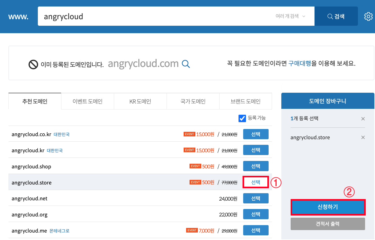 2. 사용 가능한 도메인들이 나옵니다. 원하는 도메인을 선택 -> 신청하기를 클릭합니다.