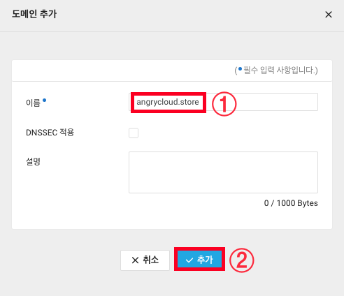 4. 가비아에서 봐뒀던 도메인명을 입력하고 추가를 클릭합니다.