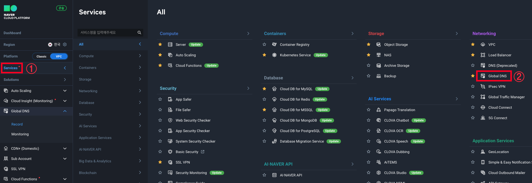 - Global DNS 생성시에 도메인명을 입력해야하고, 도메인 구입시 네임서버를 설정할 수 있는데 이 네임서버는 DNS를 생성해야 확인 가능합니다.