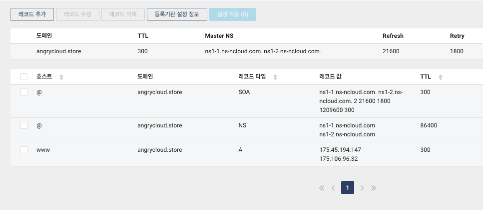 레코드 값 : 175.45.194.147, 175.106.96.32 (Web01과 02의 IP, 여러 IP 등록시 줄바꿈으로 등록)