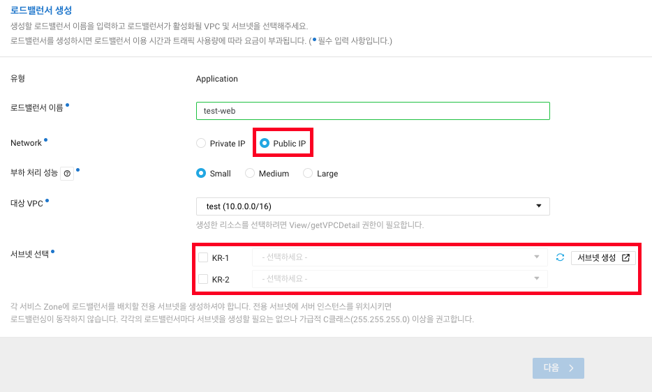 Network : 외부에서 들어오는 트래픽을 분산해야하니 Public을 선택합니다.