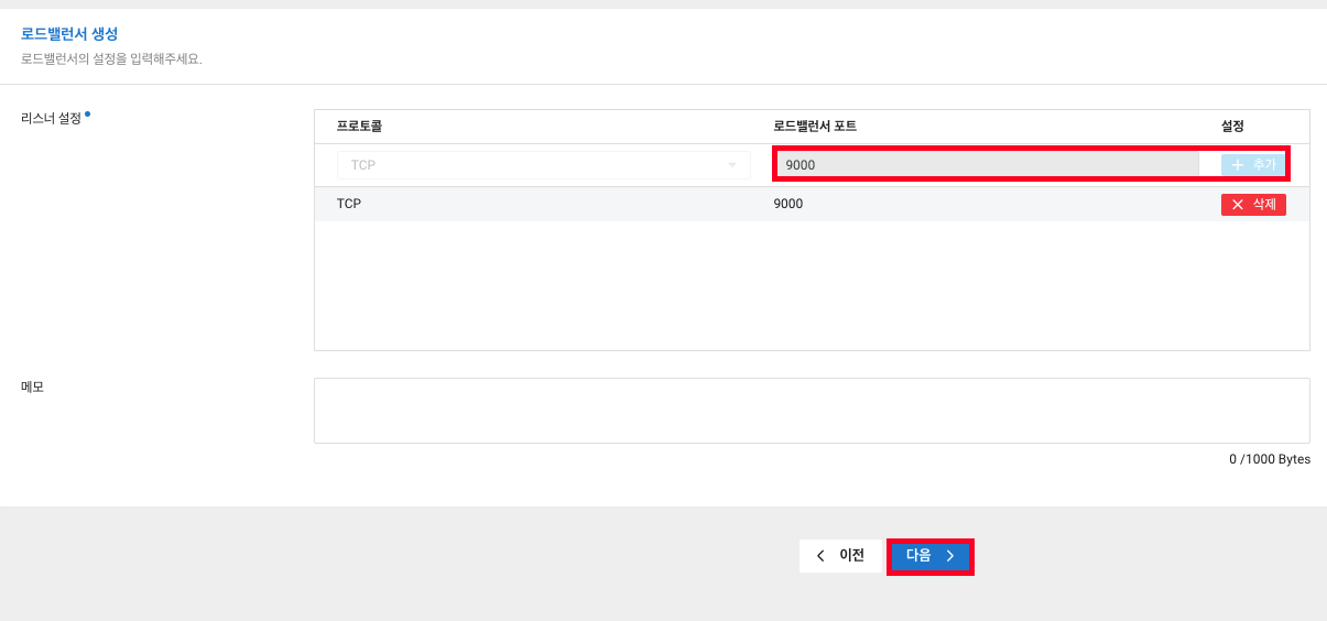 11. 분산해야 할 요청(TCP 9000) 추가 후 다음을 클릭합니다.