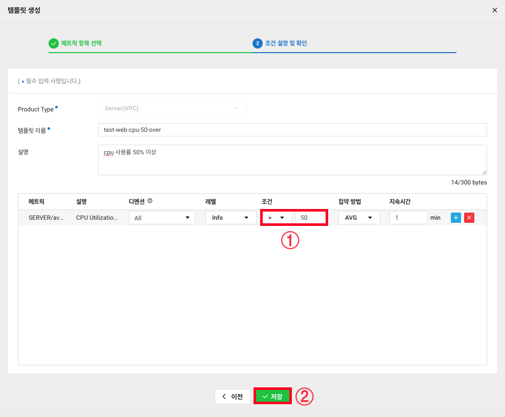 5. cpu 사용률에 대한 알람을 받을 예정이니 템플릿 이름과 설명, 메트릭을 cpu 사용률로 선택하고 다음을 클릭합니다.