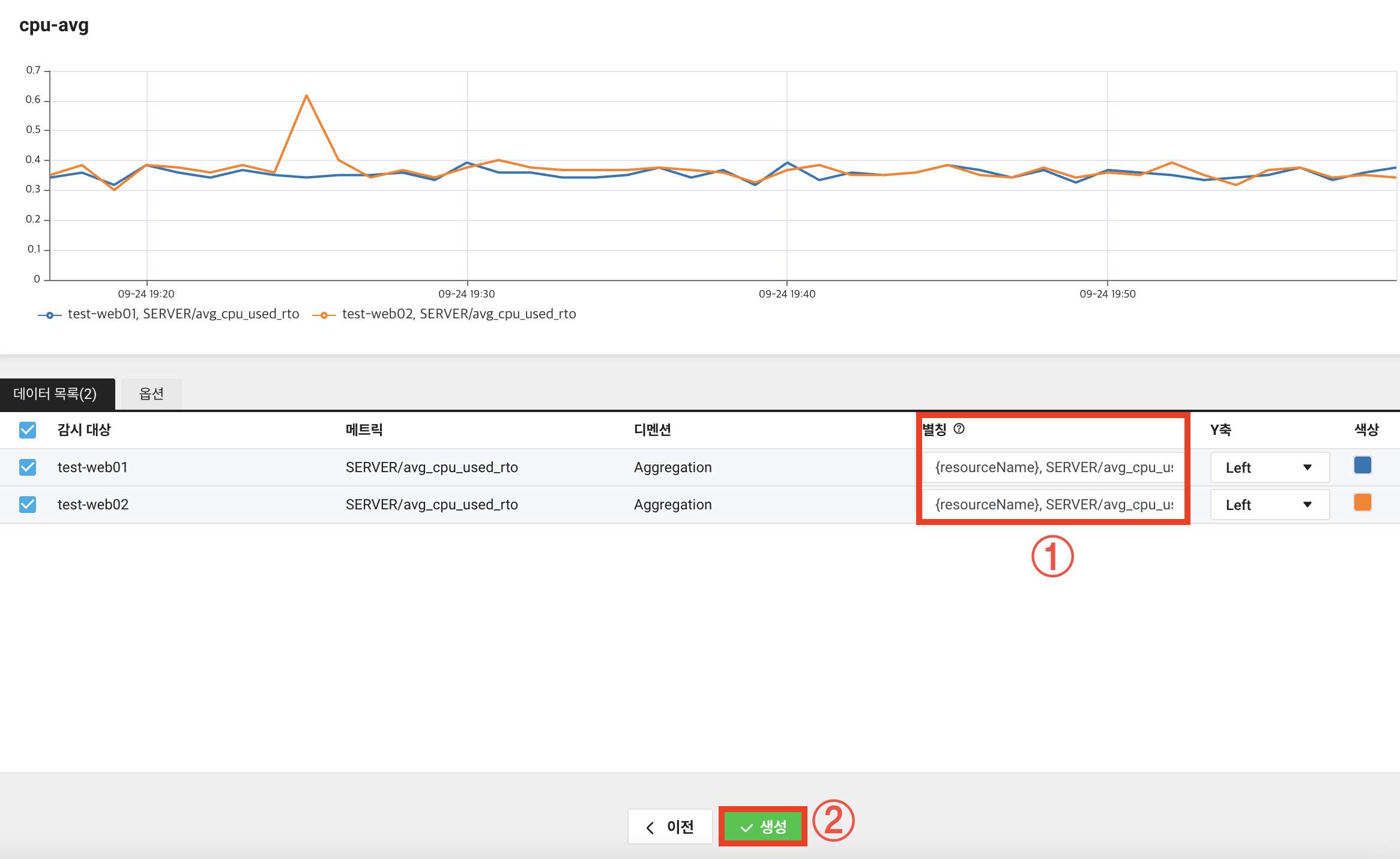 11. 선택한 감시 대상에 서버가 추가된 것을 확인하고 생성을 클릭합니다.