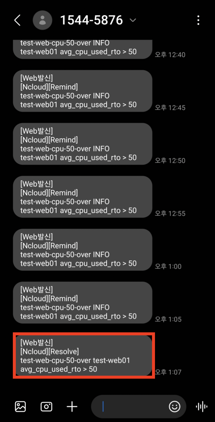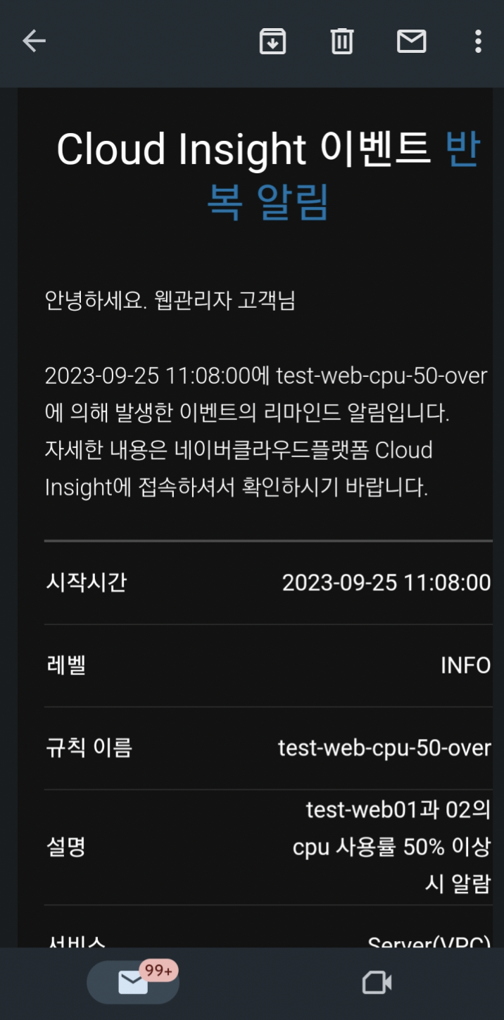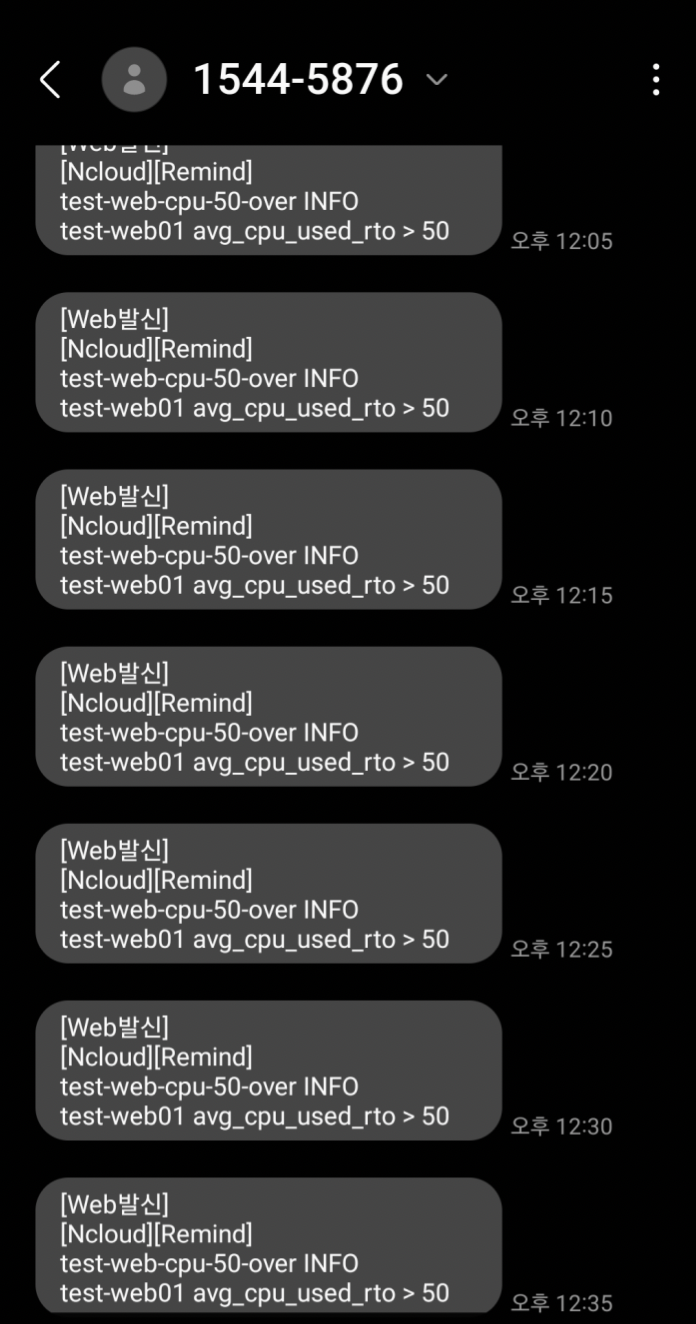 7. 다시 서버에 부하를 주고 점검시간에 알람이 오는지 확인합니다.