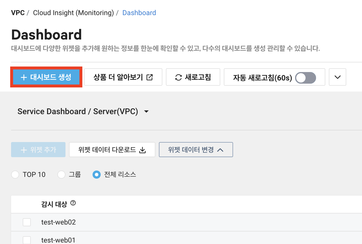 Cloud Insight에서 모니터링 가능한 서비스들은 서비스가 생성되어 있다면 이렇게 기본 Dashboard가 생성되어 자동으로 모니터링을 시작합니다.