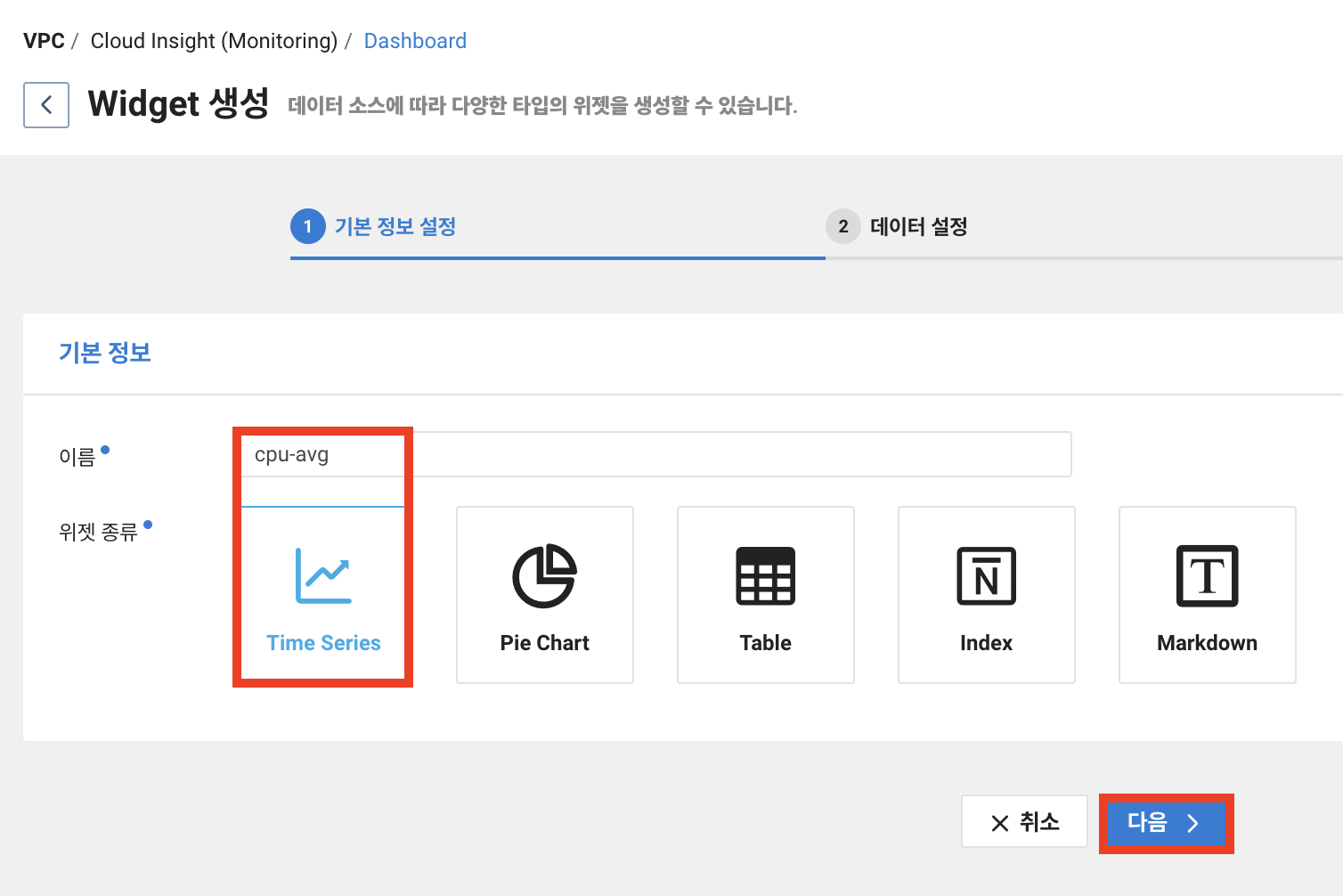 8. 위젯의 종류를 선택할 수 있습니다. 전 원하는 이름과 위젯 종류를 선택하고 다음을 클릭합니다.